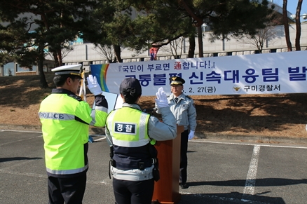 구미경찰서(서장 이준식)는 2월 27일 박정희체육관 앞에서 구미경찰서 녹색어머니회, 모범운전자연합회 구미지회 회원들이 참석한 가운데 '교통불편 신속대응팀' 발대식을 가졌다.