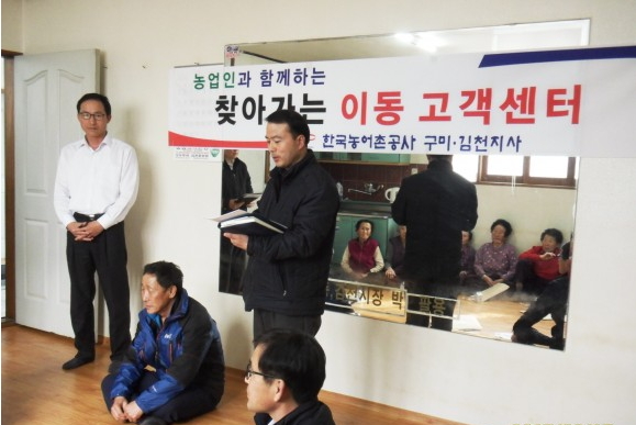 한국농어촌공사 구미ㆍ김천지사(지사장 이명준)는 3월 17일 김천시 남면 봉천1리 마을회관에서 2015년 첫 '찾아가는 이동고객센터'를 운영해 지역농업인과 소통하는 시간을 가졌다.