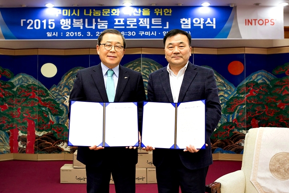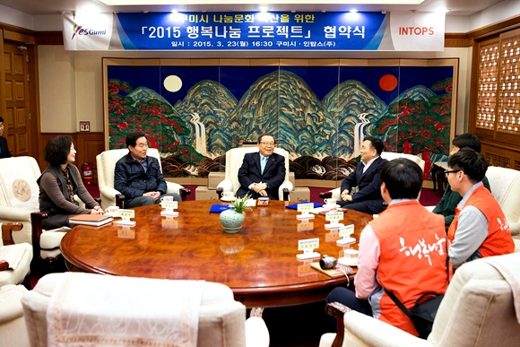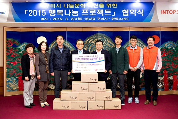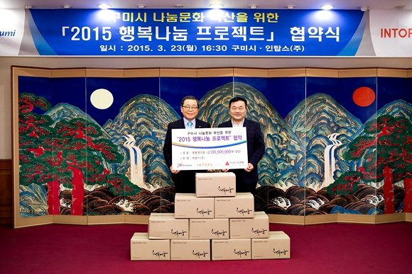구미시(시장 남유진)와 인탑스(주)는 3월 23일 국제통상협력실에서 나눔문화 확산을 위한 '2015 행복나눔 프로젝트'협약식을 가졌다.