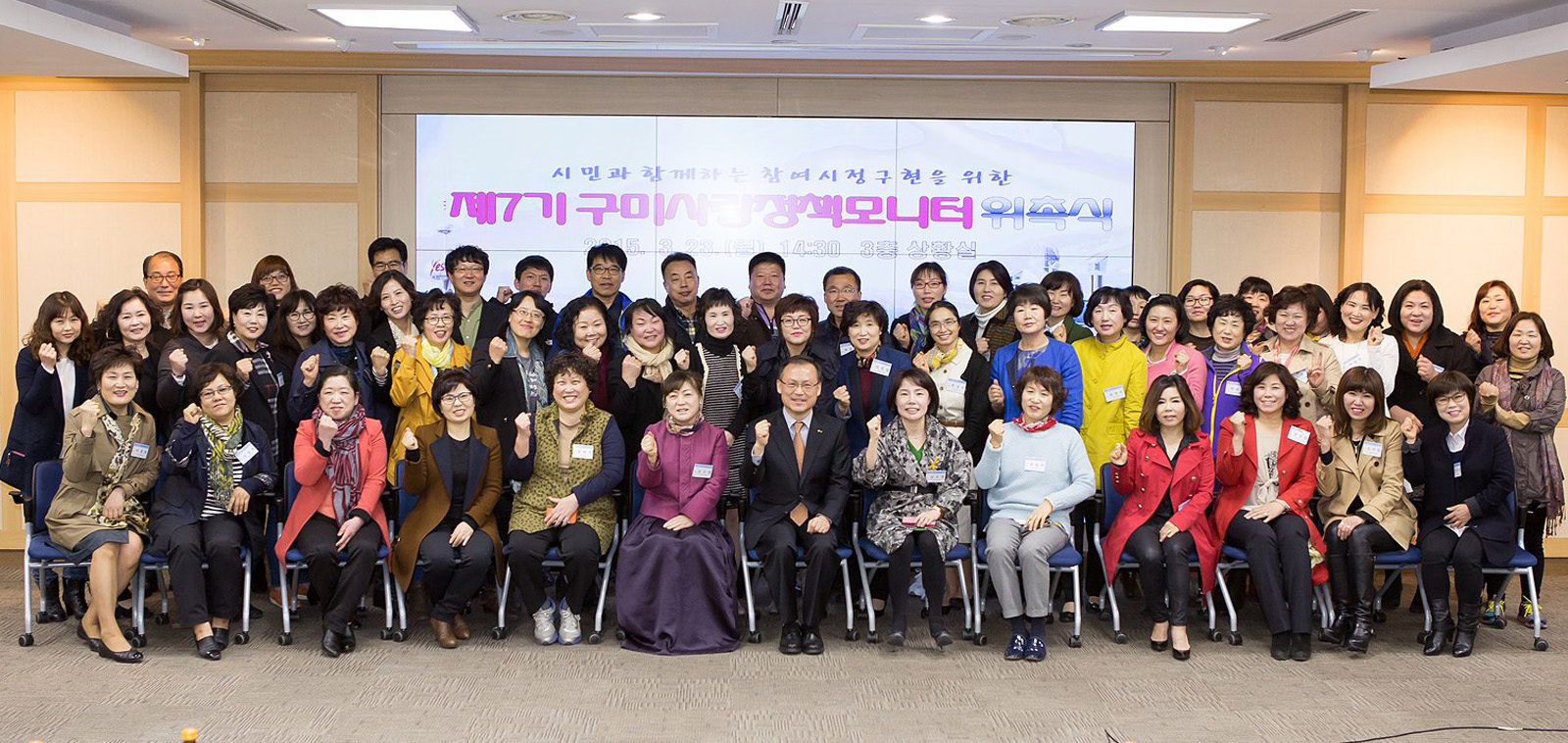 구미시(시장 남유진)는 3월 23일 시청 3층 회의실에서 구미사랑정책모니터 및 담당자 100여명이 참석한 가운데 시민이 만족하는 행복도시 구현을 위한 '제7기 구미사랑정책모니터' 위촉식 및 간담회를 개최했다.