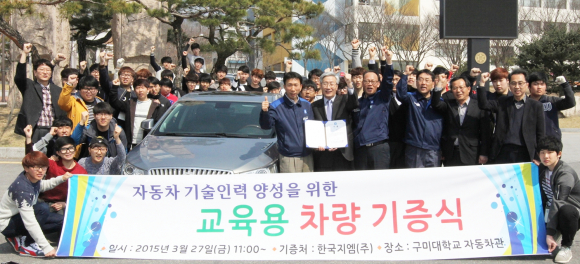 구미대 본관 앞에서 가진 '자동차 기술인력 양성을 위한 교육용 차량 기증식'에는 서영택 구미대 산학협력단장, 김영호 한국지엠 대구지역본부장, 자동차기계공학과 학생 등 80여 명이 참여했다.