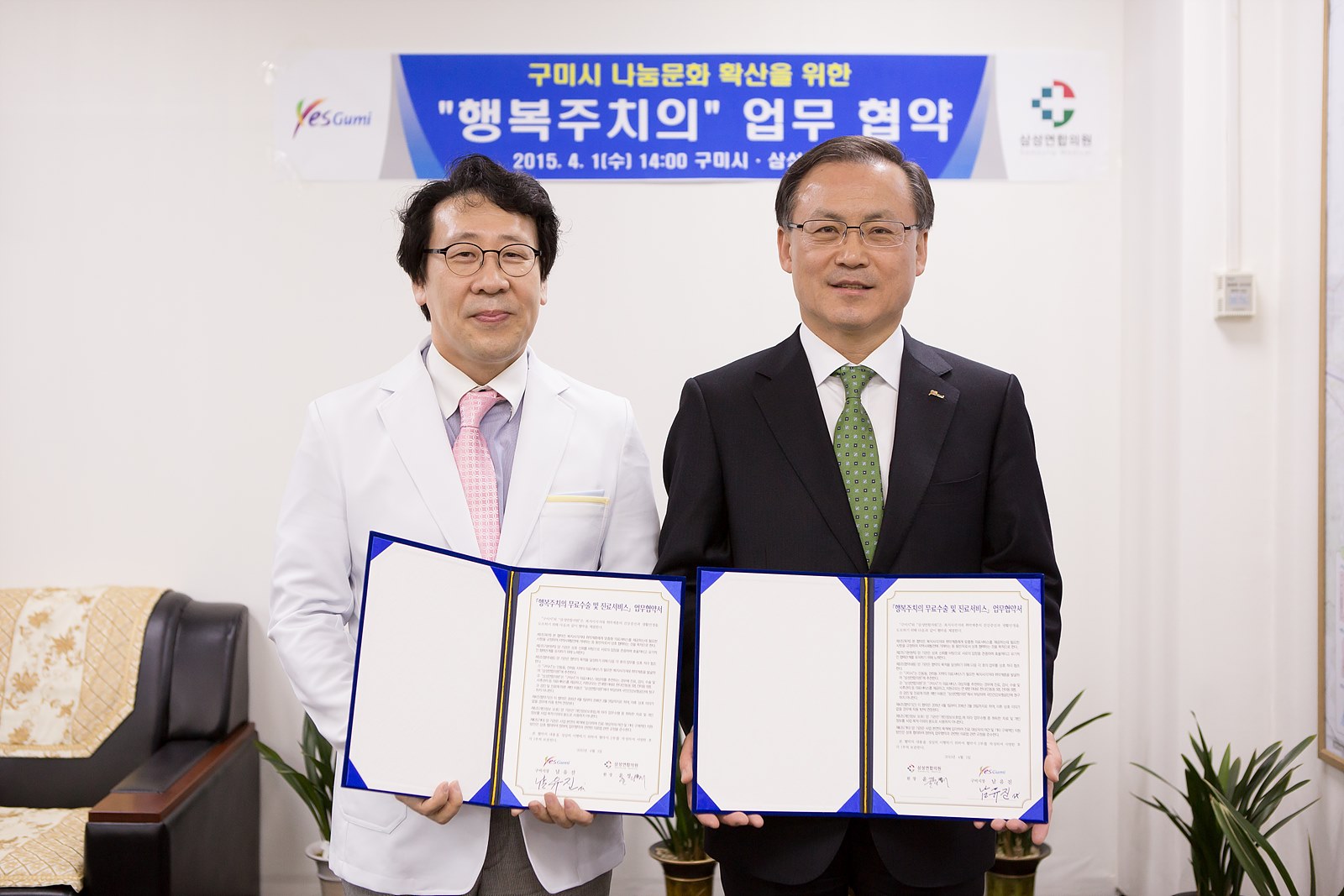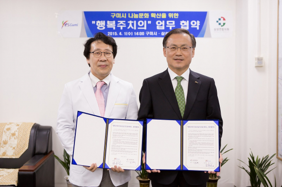 구미시(시장 남유진)는 4월 1일 부시장실에서 소외계층 의료복지 증진 및 구미시 나눔문화 확산을 위해 삼성연합의원(원장 윤정해)과 '행복주치의' 업무 협약식을 가졌다.