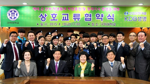 협약식에는 구미대 신혜경 대외협력처장과 KDB생명 명경호 본부장을 비롯한 양측 실무 관계자 및 군사학부 재학생 등 30여명이 참석했다. 이날 협약으로 KDB생명은 군 간부 후보생들의 안정적인 학업증진을 위해 장학금을 지원하고 올바른 경제지식 함양을 위한 재무특강을 학기당 1회 실시하기로 했다.