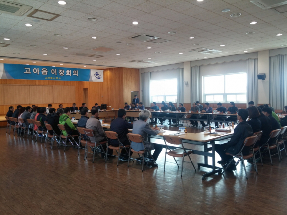 고아읍(읍장 김회식)은 4월 10일 읍사무소 3층 강당에서 이장 및 기관단체장 등 50여명이 참석한 가운데 4월 이장회의를 개최했다.