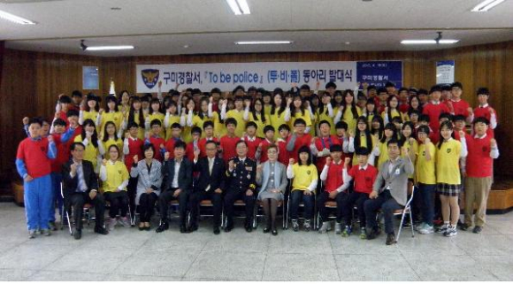 구미경찰서(서장 이준식)는 4월 16일 4층 송정마루에서 경찰서장, 교육장, 학부모 대표 등이 참석한 가운데 도경양과 유진양처럼 장래 경찰관을 꿈꾸는 15개 중ㆍ고등학교 학생 100여명을 초청해 '투비폴리스'동아리 발대식을 가졌다