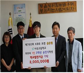 사곡고등학교(교장 전만영) 3학년 1반에 재학중인 송민식 학생이 지난 3월 15일 방송된 KBS 도전! 골든벨(사곡고편)에서 최후의 1인으로 남아 받은 장학금 전액(1백만원)과 자비를 보태어 총 2백만원을 학교발전기금으로 기탁해 화제가 되고 있다.