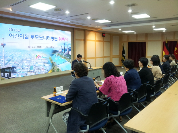 구미시(시장 남유진)는 4월 28일 시청 상황실에서 어린이집을 이용하는 부모와 보육ㆍ보건전문가로 구성된 '어린이집부모 모니터링단' 위촉식을 개최했다.