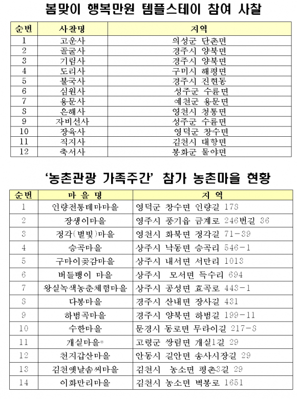 또한, 불국사, 은해사, 등 도내 12개 사찰에서 1만원으로 템플스테이 체험할 수 있는 '행복만원 템플스테이'행사를 진행하고 김천 이화만리마을을 비롯한 도내 14개 농촌마을에서 체험행사를 진행한다.
