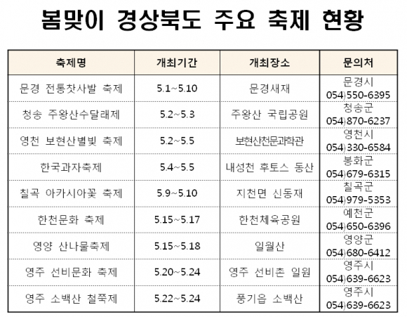 경북도에서는 5월 문경 전통찻사발 축제 등 9개의 주요축제가 열리고, 5월 1일 ~ 14일까지 관광주간과 연계해 '봄맞이 행복만원 템플스테이' 12곳, '농촌관광 프로그램'14개 운영 등 다양한 볼거리 즐길거리로 관광객을 맞는다.