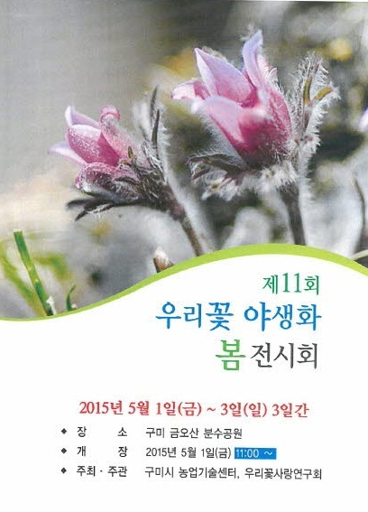 구미시농업기술센터(소장 이해권)와 우리꽃사랑연구회(회장 마점선)는 산과 들의 싱그러운 야생화 작품 500여점을 준비해 5월 1일 ~ 3일까지 3일간 구미 금오산 분수공원에서 '제11회 야생화 봄꽃 전시회'를 개최한다.