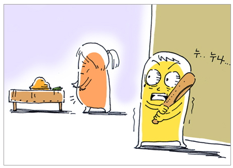 몇 분 후, '달그닥' 열쇠를 따는 소리가 났습니다. '삐그덕' 현관문이 열립니다. 전 숨죽인 채 야구 방망이 하나를 들고 주방 입구를 응시하고 있었는데 그만 비명을 지를 뻔 했습니다.