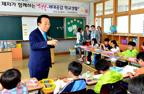 김관용 경북도지사는 5월 14일 구미초등학교를 방문해 4학년을 대상으로 ‘꿈과 희망이 넘치는 행복한 학교생활’이란 주제로 일일교사 체험활동을 펼쳤다. |
