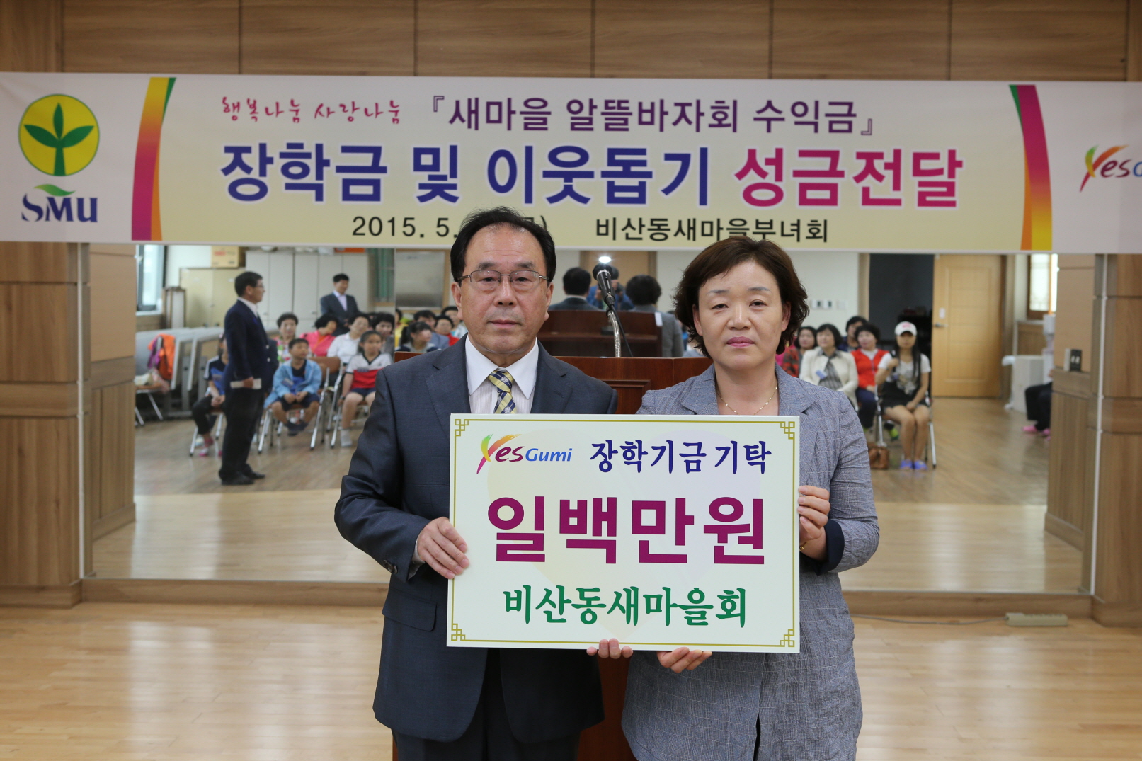 부녀회는 구미시 장학기금 100만원, 비산초등학교 학생 5명에게 장학금 100만원, 관내 어려운 가정 5세대에 이웃돕기 성금 100만원을 기부했다.