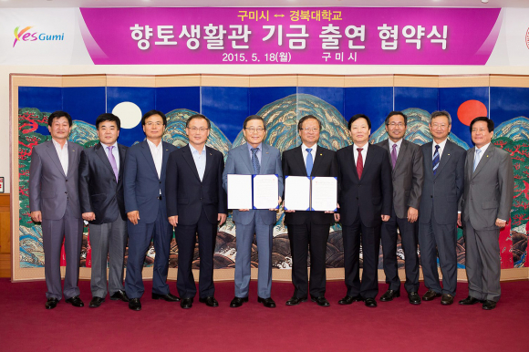 구미시(시장 남유진)는 5월 18일 시청 국제통상협력실에서 경북대학교(총장 손동철 직무대리)와 향토생활관(기숙사) 출연기금으로 2억원을 추가 출연하는 협약식을 체결했다.