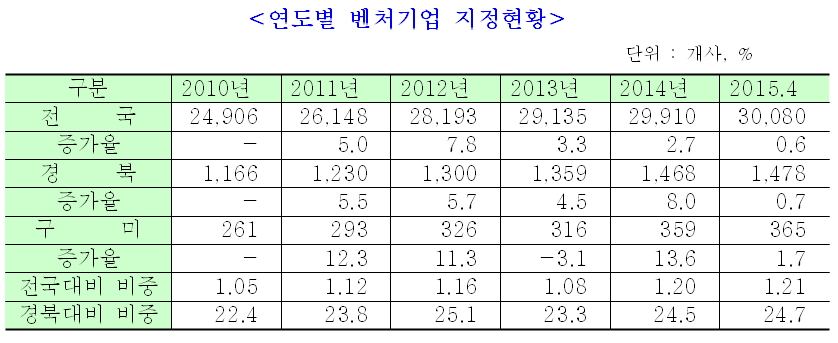 경북에서 차지하는 비중은 2010년 22.4%, 2012년 25.1%, 2014년 24.5%, 2015년 4월 24.7%로 IT벤처 중심도시 면모를 보이고 있으며, 전국대비 비중 역시 2010년 1.05%에서 2011년 1.12%, 2014년 1.20%, 2015년 4월 1.21%로 소폭 증가했다.