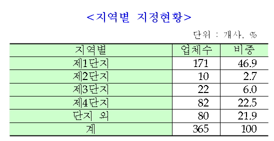 또한 구미지역의 365개 벤처기업 중 구미국가산업단지 내에 소재하고 있는 기업은 285개사(78.1%), 단지 외 80개사(21.9%)로 1단지 171개사(46.9%), 2단지 10개사(2.7%), 3단지 22개사(6.0%), 4단지 82개사(22.5%)를 각각 차지하고 있다.
