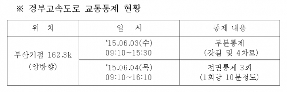 6월 3일(수)에는 오전 09:10 ~ 오후 15:30까지 갓길 및 4차로에 대해 부분통제를 실시하고 6월 4일(목)에는 오전 09:10부터 ~ 16:10까지 총3회(1회당 10분 정도) 전면통제를 실시한다고 밝혔다.
