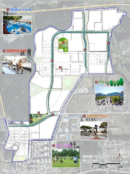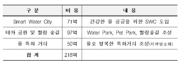 이에 따라 K-water에서는 ICT 기반의 물관리 기술을 적용해 건강한 물을 공급하고 상업지역내 물길과 공원에 어린이 물놀이 시설을 만드는 등 물을 주제로 하는 특화계획을 수립했다.