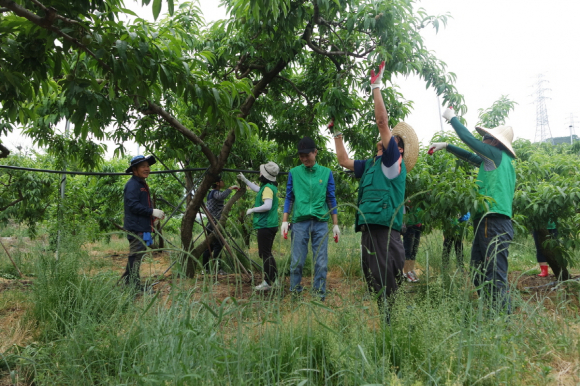 이번 농촌 일손돕기는 일손이 부족한 장천면 복숭아 재배농가(장용운氏 소유)를 찾아 서툴지만 좋은 결실을 위해 접과 작업에 정성을 다했다.