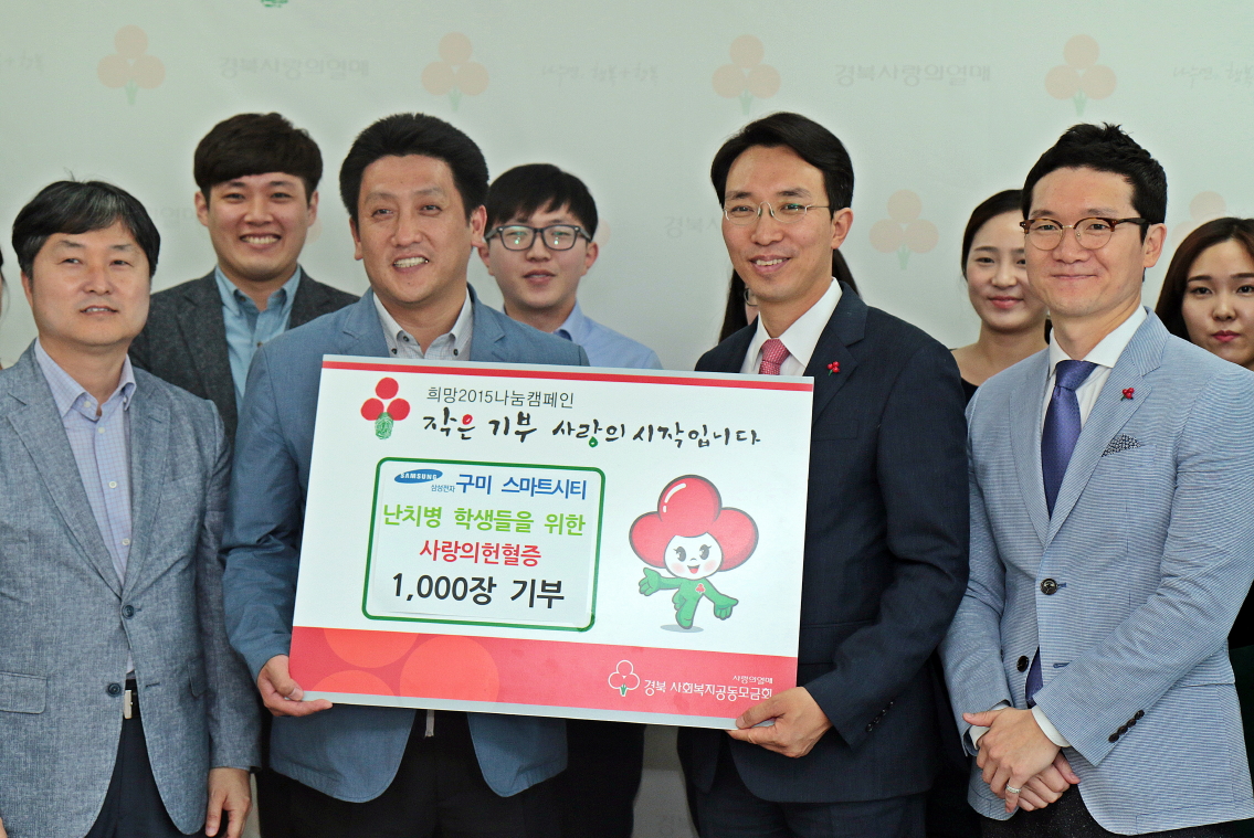 삼성전자 구미 스마트시티(공장장 심원환)는 6월 9일 난치병으로 고통받고 있는 도내 아동·청소년들의 빠른 쾌유를 돕는데 써달라며, 헌혈증 1,000매를 경북사회복지공동모금회(회장 신현수)에 기부했다.