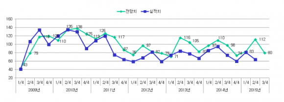 또한 기업규모별 경기전망은 2015년 2/4분기 실적추정치는 대기업 86, 중소기업 60으로 모두 기준치를 하회하였고, 2015년 3/4분기 전망치는 대기업 86, 중소기업 79로 여전히 악화 전망이 우세했다.