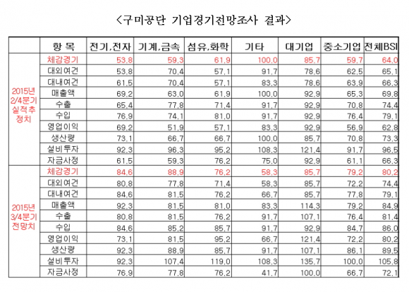 업종별 경기전망은 2015년 2/4분기 중 실적추정치는 전기전자 54, 기계금속 59, 섬유화학 62, 기타 100으로 집계되었고, 2015년 3/4분기 전망치는 전기전자 85, 기계금속 89, 섬유화학 76, 기타 58로 나타나 기타업종을 제외한 전 업종에서 2/4분기 대비 수치가 상승했으나 기준치에 미치지 못했다.