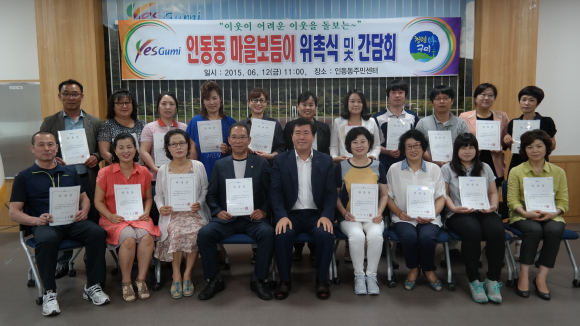 인동동(동장 박세범)은 6월 12일 동주민센터 다목적강당에서 마을보듬이 위원 등 40여명이 참석한 가운데 인동동 마을보듬이 위촉식 및 간담회를 가졌다.