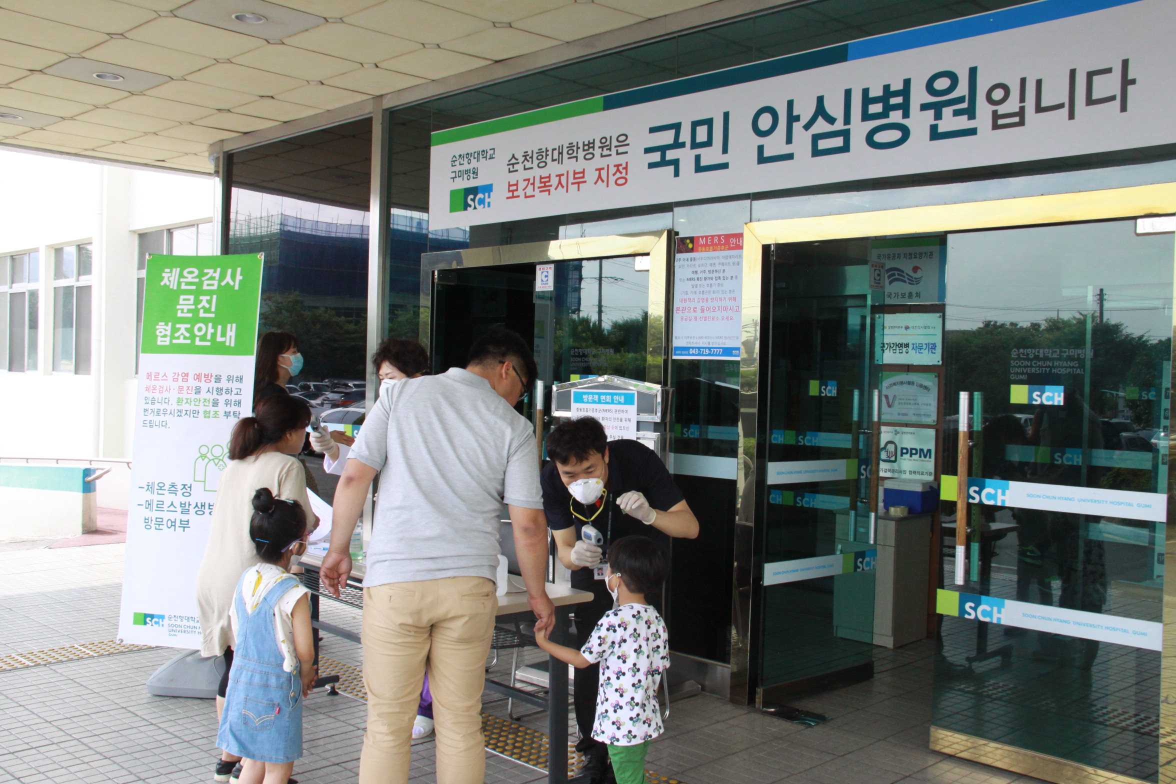 순천향대학교 구미병원은 6월 18일부터 병원의 모든 출입구를 단일화하여 내원하는 환자와 모든 방문객을 대상으로 체온측정 및 경유병원을 확인하고 있다.