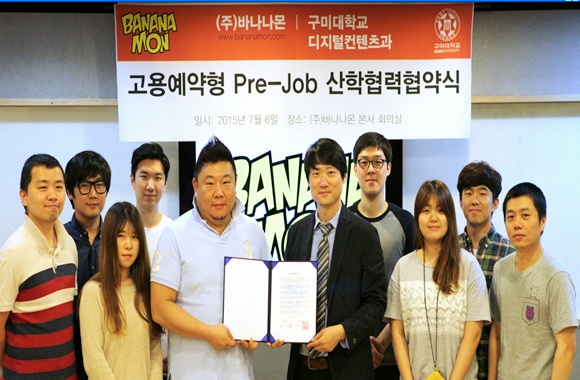 구미대학교(총장 정창주)는 7월 6일 게임그래픽 전문회사인 (주)바나나몬(대표 노홍식)과 전문인력 양성 및 취업지원에 관한 고용예약형 협약(MOU)을 체결했다.