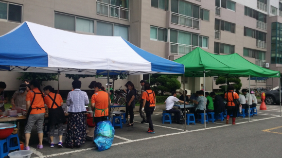 진미동(동장 이근도)에서는 7월 10일 진평미래타운부녀회(회장 이원정) 주관으로 아파트 내 주차장에서 인근 어르신(80여명)들을 모시고 초복행사를 개최했다.
