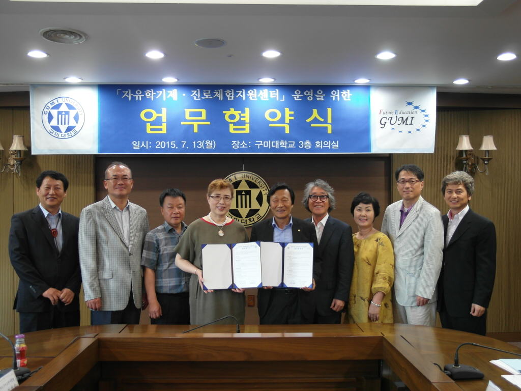 구미교육지원청(교육장 김정숙)은 2015년 7월 13일 구미대학교 평생교육원과 자유학기 진로체험 지원센터 운영을 위한 협약식을 가졌다.