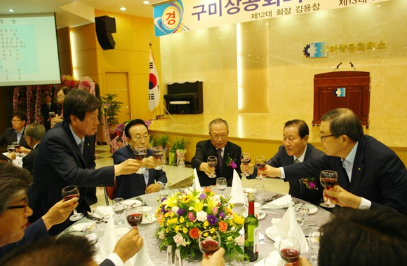 이날 행사에는 김용창 명예회장, 김관용 경상북도지사, 남유진 구미시장, 김태환·심학봉 국회의원, 김익수 구미시의회 의장, 김영식 금오공대 총장, 윤창욱 경상북도의회 부의장, 이준식 구미경찰서장, 윤광수 경북상의협의회장을 비롯한 각 기관단체장, 구미상의 고문, 상공의원 및 회원사 대표 등 300여명이 참석한 가운데 김용창 전 회장의 이임식도 함께 진행됐다.