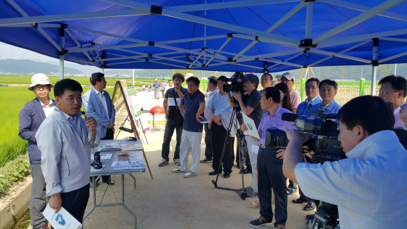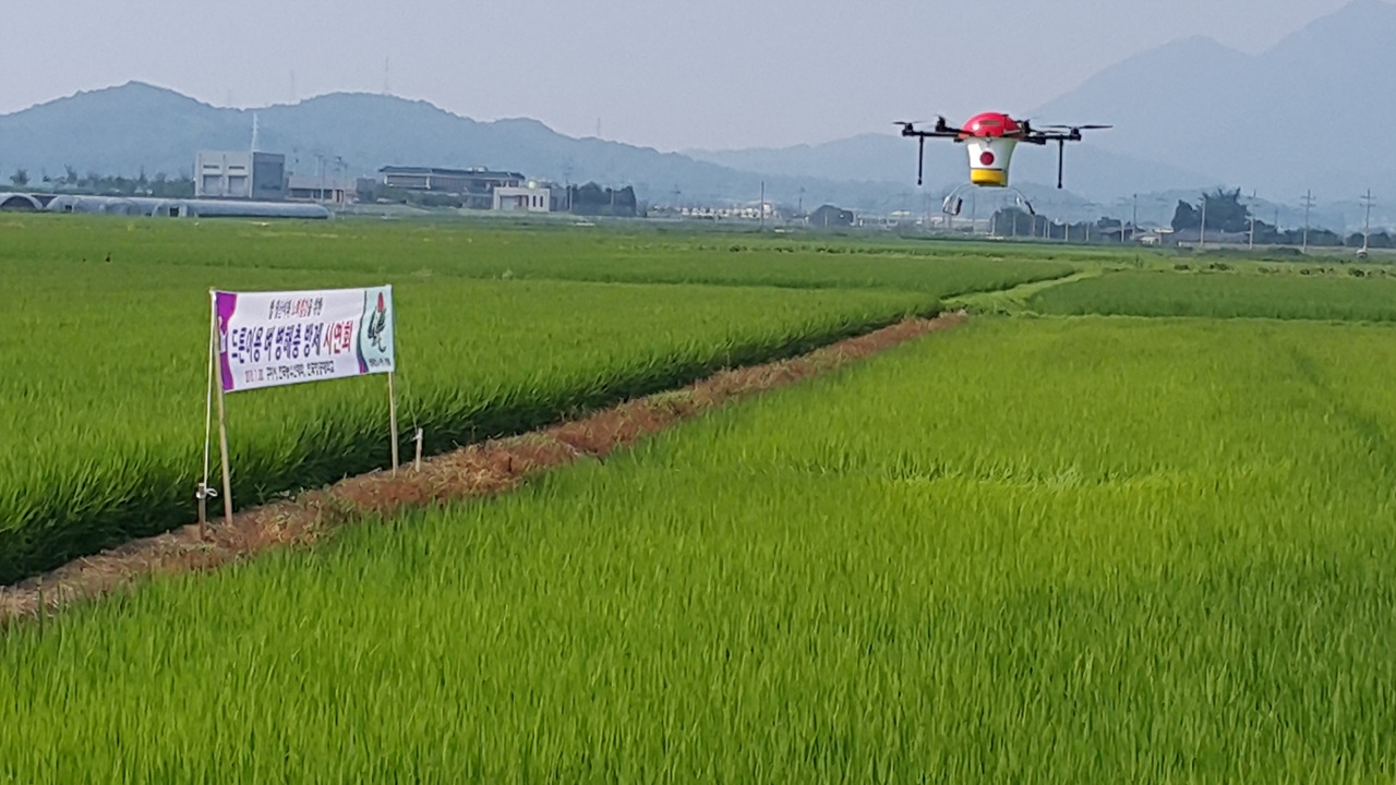 구미시농업기술센터(소장 이해권)와 한국항공대학교, 한국농수산대학 공동 주관으로 전국 최초로 드론을 이용한 벼 병해충방제 농약살포 시연행사를 7월 30일 구미시 산동면 성수들에서 가졌다.
