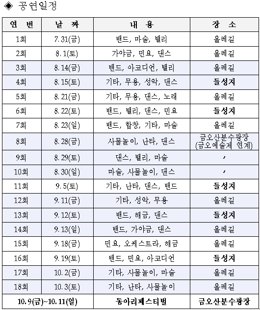 공연은 10월 11일까지 금오산 올레길과, 들성지에서 오후 7시 30분에 열리며, 문의는 한국예총구미지회(☎054-451-4422)로 하면 된다.