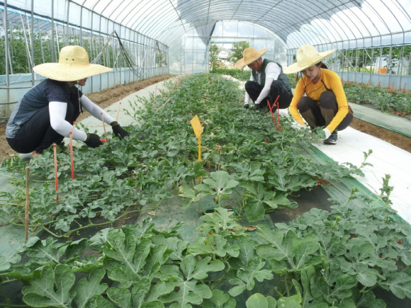 구미시농업기술센터(소장 이해권)에서는 씨 없는 미니수박을 구미의 특화작목으로 육성하기 위한 재배기술을 메뉴얼화 하기 위해 삼복더위 하우스 속에서 구슬땀을 흘려가며 연구에 몰두하고 있다.