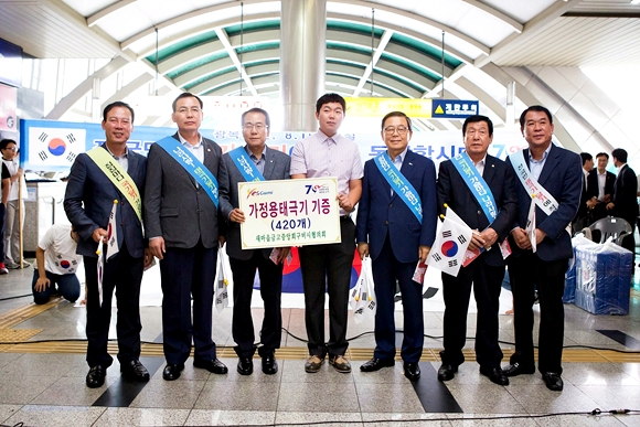 특히 한국자유총연맹구미시지회와 새마을금고중앙회구미시협의회는 광복70년을 맞아 나라사랑하는 마음으로 태극기 1,000여개를 개인택시 구미시지부와 봉곡동 코아루 아파트 자치회에 전달하는 기증식도 가졌다.