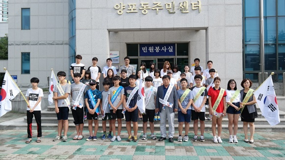 양포동(동장 박태병)은 광복 70주년의 역사적인 해를 맞아 8월 13일 관내 일원에서 양포동 직원과 중고등학생 30여명이 참여한 가운대 ‘나라사랑 태극기 달기 운동’ 캠페인을 실시했다.