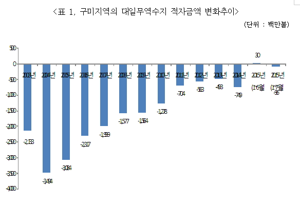 구미상공회의소(회장 류한규)가 구미공단의 수출입동향 변화추이를 분석한 결과 전년대비 수출 감소폭보다 유가하락 등으로 수입 감소폭이 더 컸으며, 특히 대일무역수지는 일본으로의 수입이 크게 하락해 사상처음 올해 상반기에 3천만불 흑자를 기록했다.