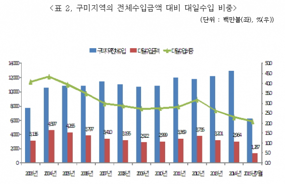 구미상의 관계자는 “구미공단 조성 이후 일본과의 무역에서 흑자를 남겼다는 점은 의미있는 일이고 수입 감소 영향이 크지만 수출 역시 3대 시장으로 진입하여 향후 일본과의 교역이 중요해 보인다며, 다만 정부의 수출활성화 정책과 맞물려 하루빨리 수출이 증가세로 반전되어 불황형 흑자가 아닌 호황형 흑자가 될 수 있도록 힘을 모아야 한다”고 강조했다.