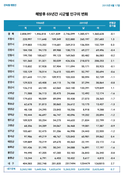 연평균 증가율이 가장 낮은 곳은 의성군으로 1946년 18만명에서 2015년 5만 5천명으로 연평균 △1.7% 감소했고 이어 예천군(△1.6%), 봉화군(△1.56%)의 순으로 나타났다.