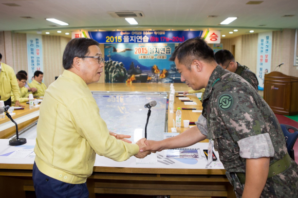구미시(시장 남유진)는 8월 20일 남유진 구미시장, 이병필 120연대장, 김성일 1대대장 및 공무원 200여명이 참석한 가운데 ‘2015 을지연습 최종 강평보고회’를 가졌다.