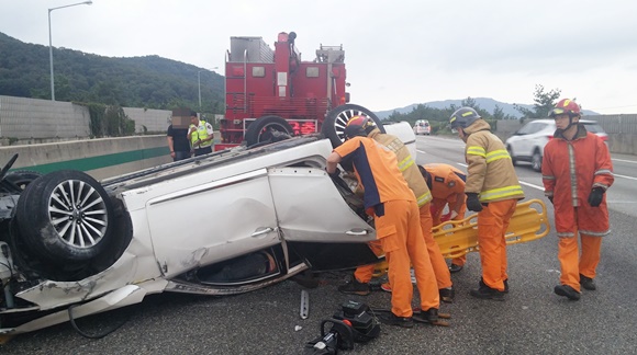 이날 사고는 차량(k7) 탑승자 2명이 주행 중 중앙분리대를 추돌해 1차로로 전복된 사고로 탑중자 2명중 1명은 자체 탈출하였고 1명은 차량내부에 팔이 끼어 나오지 못해 구조대가 구조한 뒤 인근병원으로 이송했다. |