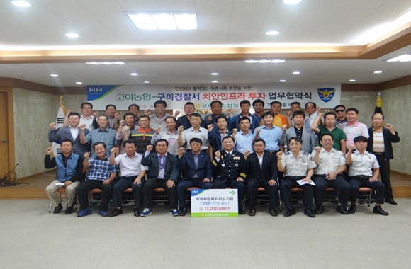 구미경찰서(서장 이준식)와 고아농협(조합장 김영찬)은 9월 9일 고아농협 대회의실에서 고아농협과 치안인프라 확충에 투자하는 업무협약을 체결하고, 고아농협의 지역사랑 복지사업 기금(1,300만원)으로 안전하고 활력 있는 지역사회를 조성키로 했다.