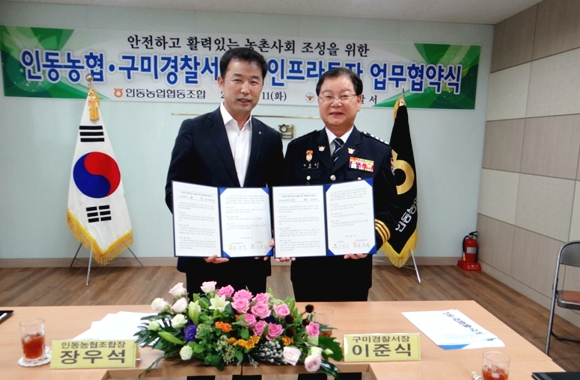 구미경찰서(서장 이준식)와 인동농협(조합장 장우석)은 인동농협 회의실에서 치안인프라 확충에 투자하는 업무협약을 체결하고, 인동농협의 지역사랑기금(1천만원)을 안전하고 활력있는 농촌사회를 조성키로 했다.
