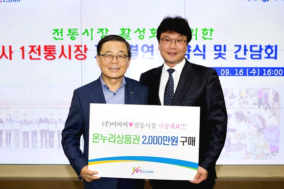 구미시(시장 남유진)는 9월 16일 시청 3층 상황실에서 기업체 대표, 기관·단체장 및 전통시장 상인회장 등 50여 명이 참석한 가운데 ‘1사 1전통시장 자매결연 협약식 및 간담회’를 개최했다.