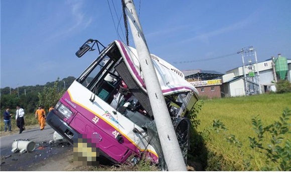 지난 9월 20일 9시 50분경, 구미시 선산읍 봉곡리 봉곡휴게소 인근 도로에서 시내버스가 전신주에 충돌하는 아찔한 사고가 발생했다.
