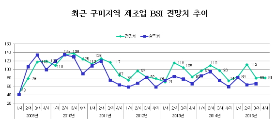 구미상공회의소(회장 류한규)가 지난 8월 27일 ~ 9월 9일까지 지역 내 90개 제조업체를 대상으로 실시한 ‘2015년 4/4분기 기업경기전망 조사’에 따르면 2015년 4/4분기 기업경기실사지수(BSI) 전망치는 ‘81’로 전분기 전망치(80)보다 1포인트 상승하였으나 업체에서는 여전히 고전할 것으로 예상된다.