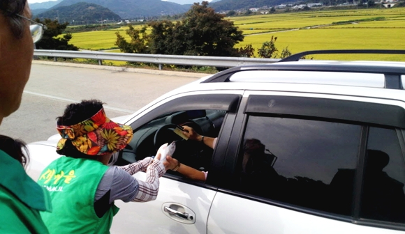 회원 20여명은 추석 명절 먼 길을 달려 고향을 방문하는 귀성객과 고향으로 출발하는 이들에게 생수, 홍보지, 사탕 등을 나눠주며 고향의 훈훈한 마음을 전달했다.