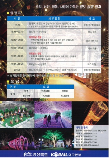 이번 청도불빛열차 상품은 매주 금요일(19:20) 동대구역을 출발, ‘감와인’으로 유명한 청도 와인터널과 어둠이 내린 밤하늘을 배경으로 펼쳐지는 ‘불빛의 향연’프로방스 포토랜드 등을 관람하는 코스로 이루어졌으며, 열차 내부에 야광조명을 설치하는 등 야간열차의 정취와 낭만을 흠뻑 느낄 수 있도록 구성했다.