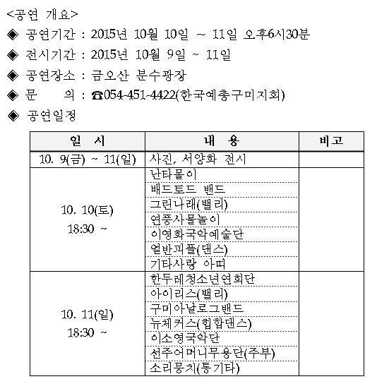 구미시(시장 남유진)가 주최하고 (사)한국예총구미지회(회장 이한석)가 주관하는 ‘215 동아리페스티벌’이 10월9일 ~11일까지, 3일간 금오산분수광장에서 개최된다.